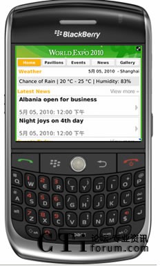 CTI論壇(ctiforum)5月6日消息(記者 楊佳林) 近日,RIM 公司與《上海日報》社共同開發(fā)的BlackBerry上海世博會應用程序正式上線。全球4100萬BlackBerry用戶均可從App World上免費下載并安裝該應用程序,實時獲取最新的上海世博會新聞、場館介紹、世博園區(qū)活動信息等,全方位了解上海世博會。CTI論壇報道