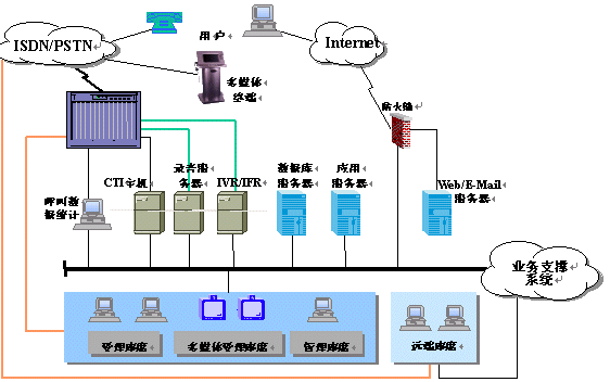 電信本地網(wǎng)客戶服務(wù)中心采用開(kāi)放的和可擴(kuò)展的體系結(jié)構(gòu),通過(guò)高度靈活的系統(tǒng)平臺(tái),為客戶提供各種窄帶和寬帶的接入方式。窄帶接入方式包括:電話、傳真、撥號(hào)上網(wǎng)等,寬帶接入方式包括:多媒體終端、公眾多媒體網(wǎng)接入等。