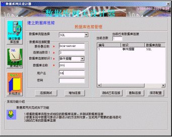 首先使用數(shù)據(jù)庫網(wǎng)關(guān)設(shè)計器定義數(shù)據(jù)庫配置,其中包括數(shù)據(jù)庫服務(wù)器的名稱和數(shù)據(jù)庫的登陸信息。該系統(tǒng)支持ODBC連接和ADO連接,支持的數(shù)據(jù)庫有ACCESS,SQL,MYSQL,ORACLE,SYBASE,配置方式如圖四所示。