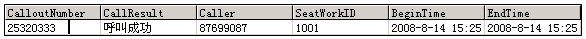 當(dāng)座席E1呼入時(shí), 接收主叫號(hào)碼(87699078), 同時(shí)發(fā)出呼叫(主叫號(hào)碼為87699078,被叫為25320333),并通過(guò)預(yù)測(cè)撥號(hào)識(shí)別各類呼叫結(jié)果,如:忙音、空號(hào)、或無(wú)人接聽(tīng)等,只將有效的通話轉(zhuǎn)接至業(yè)務(wù)人員,同時(shí)將呼叫結(jié)果寫入數(shù)據(jù)庫(kù)UT_IMCALL表(如下圖),
