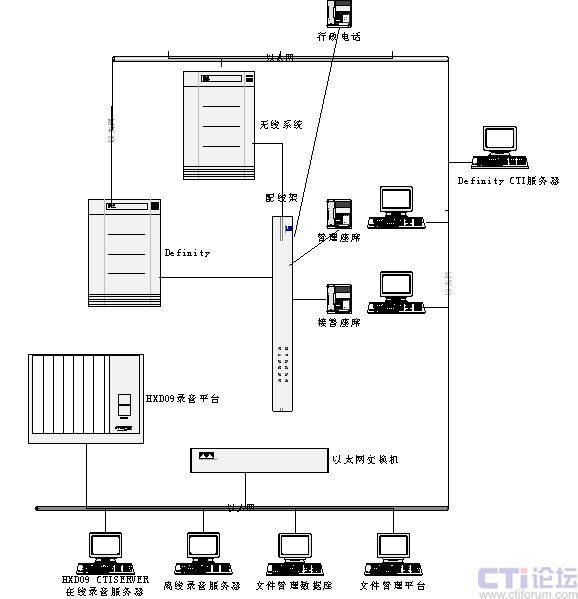 - HXD09 CTI服務(wù)器(在線錄音服務(wù)器):HXD09交換機(jī)系統(tǒng)服務(wù)器,開(kāi)發(fā)平臺(tái)。完成系統(tǒng)部分控制,在線錄音等功能。