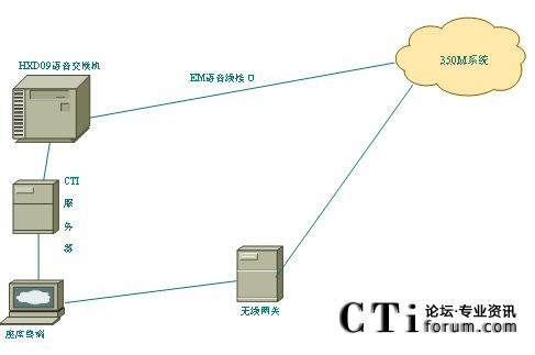 HXD09交換機(jī)通過(guò)EM接口與350M的語(yǔ)音線連接,當(dāng)需要呼叫某一無(wú)線終端時(shí),由座席端發(fā)起呼叫請(qǐng)求到無(wú)線網(wǎng)關(guān),當(dāng)獲取到無(wú)線網(wǎng)關(guān)返回的語(yǔ)音通道后,HXD09交換機(jī)將和350M系統(tǒng)對(duì)應(yīng)的語(yǔ)音通道連接起來(lái),實(shí)現(xiàn)有線座席和無(wú)線終端之間的通話,并可對(duì)通話進(jìn)行錄音;座席也可插入到無(wú)線終端或者某一集群之間,實(shí)現(xiàn)監(jiān)聽或者插話,這一過(guò)程同樣可以全程錄音。