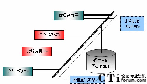 通過對消防安全監(jiān)控指揮中心業(yè)務(wù)的分析,引進(jìn)先進(jìn)的數(shù)據(jù)通信網(wǎng)絡(luò)和語音通訊網(wǎng)絡(luò),我們可以將未來的消防業(yè)務(wù)層次抽象地概括為四層(如圖所示):管理決策層、火警監(jiān)測層、指揮調(diào)度層和作戰(zhàn)行動(dòng)層。與管理決策層對應(yīng)的組織機(jī)構(gòu)為消防通信指揮中心;與火警檢測層、指揮調(diào)度層對應(yīng)包括消防指揮中心的接處警子系統(tǒng)、指揮調(diào)度等子系統(tǒng);與作戰(zhàn)行動(dòng)層對應(yīng)的組織機(jī)構(gòu)為消防站(消防隊(duì))和消防車及消防隊(duì)員。
