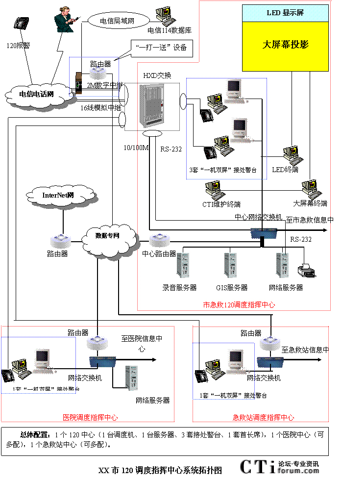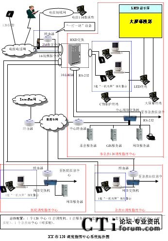 - 樹立大網(wǎng)絡(luò)概念:采用先進(jìn)的通訊、計(jì)算機(jī)網(wǎng)絡(luò)技術(shù)(如CTI技術(shù)),利用現(xiàn)有的通信資源,實(shí)現(xiàn)市人民醫(yī)院120指揮中心與急救分站的計(jì)算機(jī)網(wǎng)絡(luò)及相關(guān)領(lǐng)導(dǎo)辦公室計(jì)算機(jī)大聯(lián)網(wǎng);形成全市范圍內(nèi)120有線、無線全方位立體調(diào)度語音通道大網(wǎng);為今后督查聯(lián)網(wǎng)、大聯(lián)動(dòng)打下基礎(chǔ)。