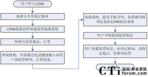 1、用戶通過手機(jī)電話訂票,首先進(jìn)入12580系統(tǒng),在12580系統(tǒng)中選擇訂票服務(wù),12580系統(tǒng)通過與訂票熱線的語音線路,把用戶接續(xù)到訂票熱線系統(tǒng)。