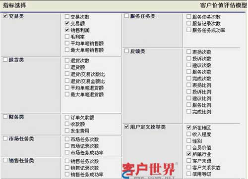 TurboCRM在長期支持CRM應(yīng)用實(shí)踐過程中,總結(jié)出一套完整實(shí)用的客戶價(jià)值評(píng)估模型,評(píng)估指標(biāo)包括交易類、財(cái)務(wù)類、服務(wù)類、反饋類、枚舉類、自定義指標(biāo)等(如圖),結(jié)合不同的指標(biāo)可以幫助企業(yè)評(píng)估客戶價(jià)值。