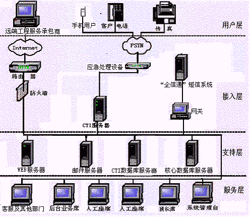 寬帶信息公司目前已建立了完善的客戶資料管理體系,能夠受理客戶客戶的業(yè)務(wù)受理、咨詢(xún)、投訴建議等,并有自己的郵件服務(wù)器和"企信通"短信服務(wù)器,因此,應(yīng)當(dāng)充分利用公司已有的系統(tǒng)設(shè)備,綜合公司實(shí)際的業(yè)務(wù)管理需要,客戶服務(wù)中心的熱線系統(tǒng)采用C/S三層體系結(jié)構(gòu),而后臺(tái)、客戶服務(wù)部門(mén)及其他部門(mén)之間的采用B/S體系結(jié)構(gòu),實(shí)現(xiàn)投訴事件在公司內(nèi)部各部門(mén)的傳遞、跟蹤管理,從而整合公司各部門(mén)資源為用戶及時(shí)周到的提供全程服務(wù)。