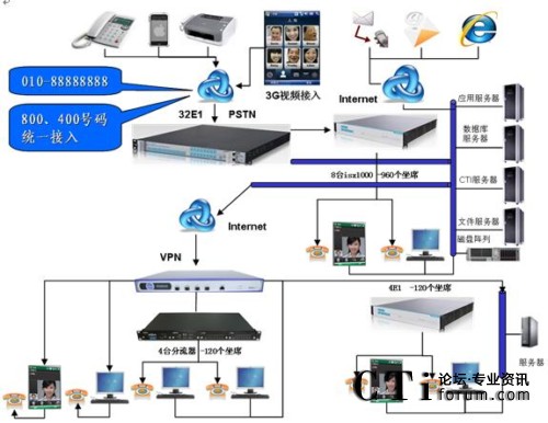 系統(tǒng)接入運營商的數(shù)字中繼、Internet寬帶網(wǎng)絡(luò),單機最大可提供本地960個模擬坐席。通過VPN(單獨組建VPN或者利用防火墻VPN也可)可將IP坐席分布到能夠聯(lián)通網(wǎng)絡(luò)的局域網(wǎng)任意一端口電腦或者部署到傳統(tǒng)Internet廣域互聯(lián)網(wǎng)的另一城市的分支機構(gòu)。