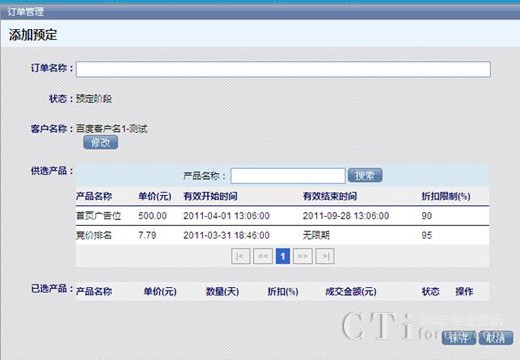 選擇訂單的名稱,供客戶選擇的產(chǎn)品,在供選產(chǎn)品列表下選擇產(chǎn)品名稱,然后所選的產(chǎn)品就會出現(xiàn)在已選產(chǎn)品列表下,完成后點(diǎn)擊【保存】,這樣一個(gè)訂單就生成了。