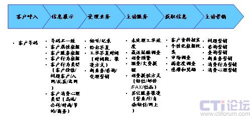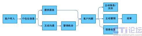 在上面的流程中,將一次客戶接觸,轉(zhuǎn)變?yōu)橐淮稳娴目蛻艋訖C(jī)會,通過對客戶信息360度的洞察和客戶的互動溝通,在為客戶提供基本服務(wù)的同時(shí),根據(jù)客戶的基本資料、歷史消費(fèi)數(shù)據(jù)等,挖掘客戶的隱性需求,從而有選擇的開展客戶關(guān)懷、客戶信息收集、客戶維系、主動營銷活動。下面以一個電信運(yùn)營商的客戶呼入流程為例,說明在一個以客戶為中心的客戶接觸流程中,坐席代表可以開展的客戶接觸活動(圖4)。