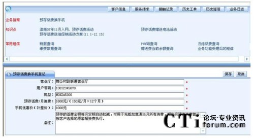 要實現(xiàn)此目的,IT支撐系統(tǒng)將高技能座席的處理能力“推送”給普通座席。第一章我們論述了IT支撐系統(tǒng)可以以客戶應用場景為核心,通過分析流程分析客戶訴求找到客戶真正的需求?梢詫⑦@一思路推演下去,針對客戶的某個具體需求,呼叫中心制定統(tǒng)一的解決方案。我們以下面的“預存話費換手機”為案例。通過先期溝通,座席已經(jīng)知曉這是客戶的真正訴求,只需要選擇好“預存話費換手機”的業(yè)務類型,IT支撐系統(tǒng)會顯示出集成在一個頁面中的全套解決方案:處理此訴求可能用到知識庫中的三個知識點;需要查詢的客戶信息,經(jīng)常給客戶發(fā)送的短信內容;處理此訴求可能執(zhí)行的登記任務,……