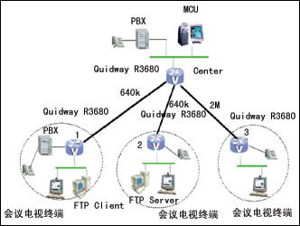 對于視頻的互通,則采用專用的視頻網(wǎng)關(guān),在中心處配置一臺MCU作為整個網(wǎng)絡(luò)視頻系統(tǒng)的管理者,1、2、3節(jié)點則配置具有視頻網(wǎng)關(guān)功能的視頻終端。在網(wǎng)上召開視頻會議時,各會場的加入和畫面的調(diào)度都由位于中心的MCU進(jìn)行控制。通過視頻網(wǎng)關(guān)壓縮的圖像的帶寬為512kbps。