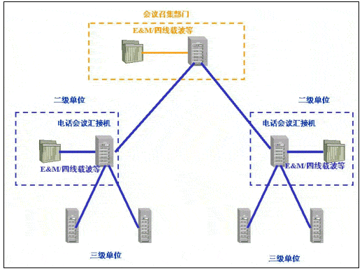 當(dāng)前國內(nèi)許多行業(yè)由于行業(yè)的業(yè)務(wù)特點(diǎn),在原有的電話網(wǎng)應(yīng)用中,電話會議作為常用的交流手段發(fā)揮著重要作用。這些行業(yè)的電話會議業(yè)務(wù),主要是通過電話會議匯接機(jī)的方式實(shí)現(xiàn):會議召集單位通過電話會議匯接機(jī)(以下簡稱匯接機(jī))通過專線、撥號等方式連通下級單位(以下簡稱二級單位)的匯接機(jī),二級單位的匯接機(jī)通過專線、撥號等方式連通所轄單位(以下簡稱三級單位)的會場電話。這樣通過多級匯接機(jī)級連的方式實(shí)現(xiàn),主持單位和二、三級單位間的電話網(wǎng)連通,利用匯接機(jī)實(shí)現(xiàn)廣播、三方通話、調(diào)度發(fā)言單位等會議功能。圖一模擬電話體制下的電話會議實(shí)現(xiàn)方案