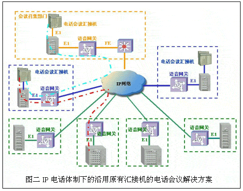 伴隨著IP網(wǎng)的建設(shè)和VoIP電話系統(tǒng)標(biāo)準(zhǔn)的日益完善,許多行業(yè)、部門開始在建設(shè)IP數(shù)據(jù)網(wǎng)的同時(shí),結(jié)合原有電話專網(wǎng)的改造,著手建設(shè)IP電話網(wǎng)絡(luò)。在IP電話網(wǎng)上實(shí)現(xiàn)原有的電話會議業(yè)務(wù)也就隨之提到日程上來。華為公司結(jié)合IP電話的特點(diǎn)和保護(hù)用戶已有投資的角度,提出延用電話會議匯接機(jī)和采用華為專用IP電話會議控制系統(tǒng)兩套解決方案: