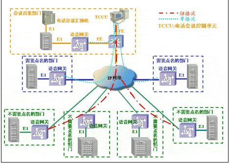 采用原有的會議電話架構(gòu),只是話音的長途連接由模擬專線等改為IP傳輸。方案由于采用原有電話會議匯接機(jī),保護(hù)了用戶的原有投資。缺點(diǎn)是在召開多級會議電話時(shí),由于語音信號首先在召集單位語音網(wǎng)關(guān)進(jìn)行壓縮,經(jīng)IP傳輸后,在二級單位語音網(wǎng)關(guān)解壓縮還原為模擬話音,再經(jīng)二級單位的語音網(wǎng)關(guān)二次壓縮,經(jīng)IP網(wǎng)傳輸后,在三級單位的語音網(wǎng)關(guān)上二次解壓縮,導(dǎo)致語音信號多次壓縮/還原,對語音質(zhì)量損傷較大。