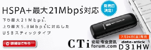 CTI論壇(ctiforum)08月05日消息: 華為近日幫助日本領(lǐng)先的移動寬帶運(yùn)營商EMOBILE發(fā)布了日本首個21.6Mb/s的HSPA+網(wǎng)絡(luò),該網(wǎng)絡(luò)將使EMOBILE有能力為日本用戶提供極快的移動數(shù)據(jù)速率,下行達(dá)21.6Mb/s。圖:華為為日本EMOBILE定制的HSPA+高速數(shù)據(jù)卡D31HW