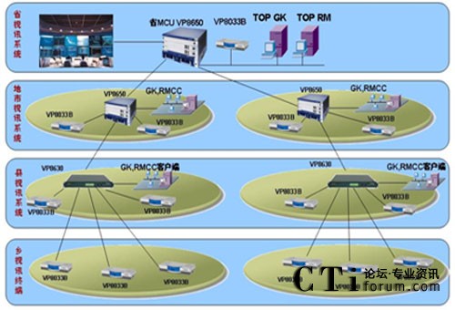 這是目前國內(nèi)最大的政府應急視頻會議指揮系統(tǒng),現(xiàn)網(wǎng)可以借鑒的經(jīng)驗很少,華為公司充分意識到該項目的重大意義,投入大量人力物力進行網(wǎng)絡(luò)環(huán)境調(diào)研和客戶需求分析,經(jīng)過眾多專家和工程人員的反復論證,最終該套系統(tǒng)采取了分布式三級級聯(lián)組網(wǎng)結(jié)構(gòu)和四級分級分權(quán)管理模式,具有強大的備份能力和豐富的功能特性,在省和9個地市分別配置1臺8650MCU和1套管理軟件,在58個縣分別配置1臺8630 MCU,在1205個會議室分別配置1臺8033B終端。