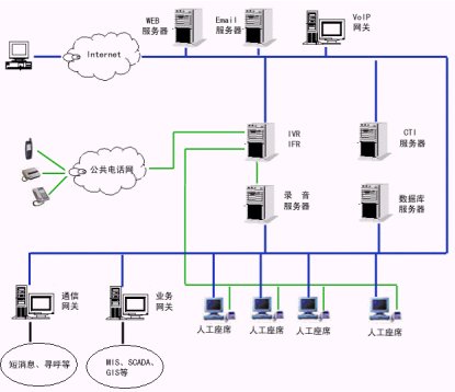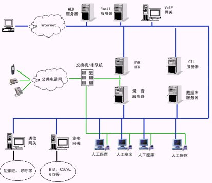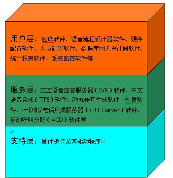 2、服務(wù)層:交互語音應(yīng)答服務(wù)器(IVR)軟件、中文語音合成(TTS)軟件、動態(tài)傳真生成軟件、外撥軟件、計算機(jī)/電話集成服務(wù)器(CTI Server)軟件、自動呼叫分配(ACD)軟件等等。