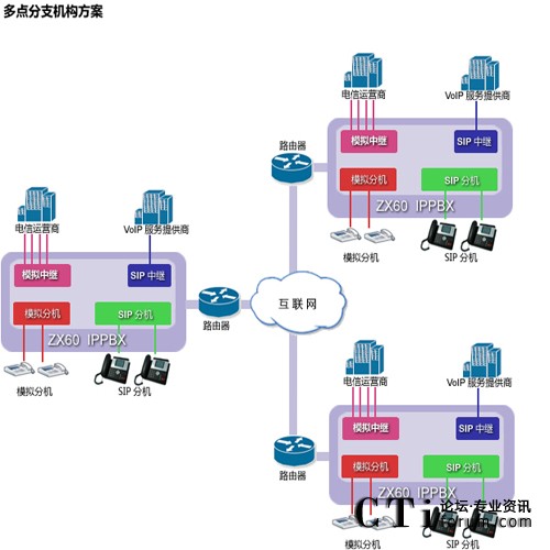 ZX60不僅具有本地電話分機(jī)接口,還運(yùn)行IP電話機(jī)遠(yuǎn)程注冊(cè),無論你若干個(gè)辦公室分布在何處,都可以打造成你內(nèi)部免費(fèi)通話的集團(tuán)電話通信系統(tǒng),節(jié)約你的內(nèi)部通信成本,提高辦公效率。