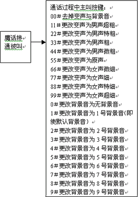 變聲通話功能也叫魔話功能,是指用戶通過通過播打特殊的號碼接入到本平臺后,再通過本平臺去呼叫最終的被叫用戶,在這樣的一個通話過程中,可以通過本平臺提供8級變聲和原聲功能:“男聲超粗、男聲特粗、男聲粗、男聲微粗、原聲、女聲微細、女聲細、女聲特細、女聲超細”。在通話過程中實時變聲,并可按鍵選擇改變變聲系數(shù)或恢復原聲,趣味非凡,超常體驗。