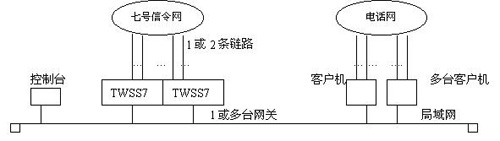 操作系統(tǒng)可以是SCOUNIX ,Windows95/NT。網(wǎng)傳通訊協(xié)議TCP/IP。不同的客戶機(jī)可以運(yùn)行不同的應(yīng)用軟件。七號控制臺用于網(wǎng)關(guān)維護(hù)和鏈路管理、參數(shù)設(shè)置等,運(yùn)行于單獨(dú)機(jī)器或某臺客戶機(jī)上。在簡單的應(yīng)用中,控制臺也可以省略。