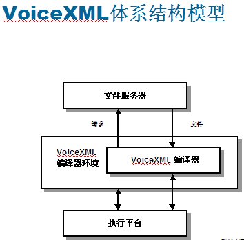 VoiceXML設(shè)計(jì)的工作原理:語音應(yīng)用程序作為系列頁存儲在類似于網(wǎng)絡(luò)服務(wù)器的文件服務(wù)器上。從實(shí)現(xiàn)平臺接收到輸入呼叫時(shí),VoiceXML編譯程序會向文件服務(wù)器發(fā)出一個(gè)特定URL請求,就像用戶瀏覽網(wǎng)絡(luò)時(shí)輸入網(wǎng)站地址一樣。文件服務(wù)器可以與編譯程序直接相連,也可以設(shè)置在外部,通過本地網(wǎng)或互聯(lián)網(wǎng)的IP協(xié)議訪問。他們可以保持應(yīng)用程序的服務(wù)邏輯,可以提供數(shù)據(jù)庫查找與其他系統(tǒng)操作功能。