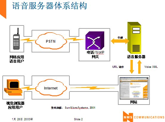 世界上最古老的用戶界面--人類語言終于在二十一世紀(jì)借助于VoiceXML,一種語音可擴(kuò)展標(biāo)記語言發(fā)展成熟起來。作為世界上第一個(gè)真正的語音通信標(biāo)準(zhǔn),它定義了應(yīng)用開發(fā)商向用戶提供新型信息訪問服務(wù)的方式。通過這種服務(wù),用戶在任何地方,都可以通過電話或任何移動(dòng)設(shè)備,虛擬訪問任何信息。VoiceXML正在被廣泛應(yīng)用于旅游、金融與信息服務(wù)等行業(yè)的各種業(yè)務(wù)領(lǐng)域中,甚至是政府部門與市政機(jī)構(gòu),全球的無線運(yùn)營商等。