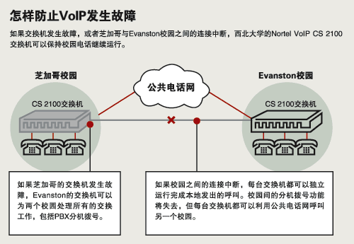 美國西北大學(xué)原來的兩臺運(yùn)營商級SL-100電話交換機(jī)(一臺安裝在芝加哥校園,一臺安裝在Evanston校園)已經(jīng)用了差不多20年。升級的目標(biāo)是將兩臺獨(dú)立的交換機(jī)合并為一臺邏輯交換機(jī)來減少管理復(fù)雜性。同時,不必更換全部數(shù)字電話。最終他們決定升級到同時支持VoIP和TDM的Nortel CS 2100 VoIP,這樣用戶不用被迫把他們的電話換為VoIP電話。Carr說:“不管是那些希望利用VoIP性能的用戶,還是想繼續(xù)使用當(dāng)前電話特性和服務(wù)的用戶,可以各取所需。”《網(wǎng)絡(luò)世界》周報