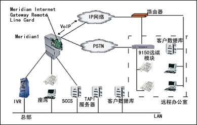 采用北電網(wǎng)絡(luò)的RemoteOffice解決方案。對(duì)于主叫用戶,與原來(lái)的撥號(hào)方案完全一樣;對(duì)于話務(wù)員座席,只是將交換機(jī)的數(shù)字座席通過(guò)廣域網(wǎng)或者專(zhuān)線方式連到遠(yuǎn)端。該方案在呼叫中心的PBX上安裝北電的Meridian