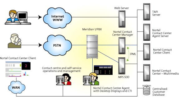 互聯(lián)網(wǎng)網(wǎng)址、PSTN、北電聯(lián)絡中心客戶端、WAN、Meridian1/PBX、聯(lián)絡中心和自助服務操作及管理、Web服務器、北電聯(lián)絡中心管理器、IPML、MPS500、帶桌面顯示器和CTI的北電聯(lián)絡中心座席、TAPI服務器、北電聯(lián)絡中心代理服務器、北電聯(lián)絡中心客戶端、北電聯(lián)絡中心—多媒體、中央客戶數(shù)據(jù)庫。