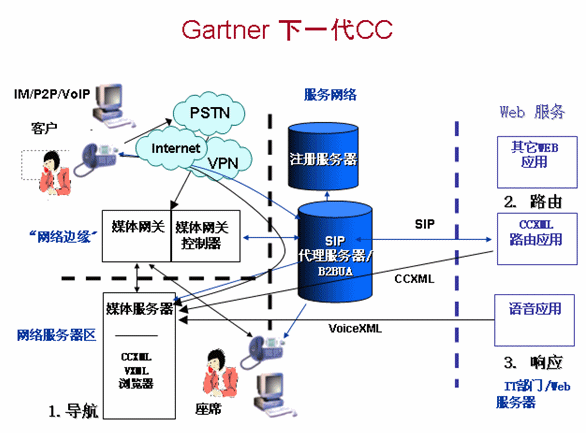 根據(jù)上圖,Gartner認(rèn)為下一代呼叫中心基于SIP架構(gòu),SIP開放特性將賦予呼叫中心系統(tǒng)更多的接入方式和應(yīng)用,其中CCXML和VXML的應(yīng)用尤為突出。