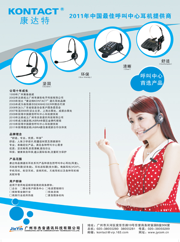 康達(dá)特通訊耳機(jī)產(chǎn)品主要應(yīng)用于企業(yè)和政府的客戶服務(wù)中心、電話營(yíng)銷中心、商務(wù)中心、緊急指揮中心、酒店總機(jī)等辦公場(chǎng)所,對(duì)于長(zhǎng)期從事電話營(yíng)銷、電話咨詢、商務(wù)調(diào)查等工作人員,是一件必不可少的通訊工具。