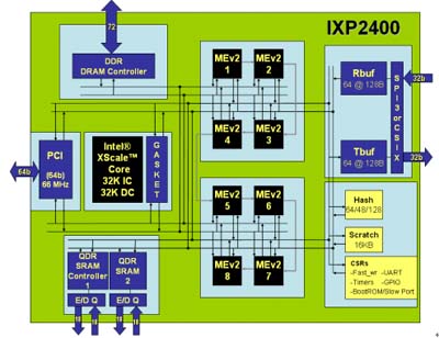 圖一是IXP-2400示意圖外觀,它有兩個信道的QDR