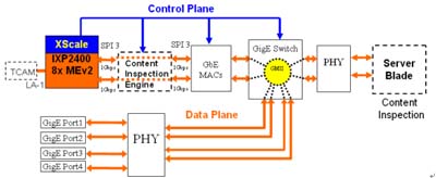 32-bit XScale來負(fù)責(zé)Control Plane的處理工作,XScale執(zhí)行相當(dāng)?shù)讓拥目刂乒ぷ,包括信息傳送,還有跟系統(tǒng)內(nèi)其它處理器的溝通。Data