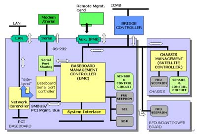 - 標準型IPMI系統(tǒng):利用背板上的IPMB總線,在系統(tǒng)槽上的CompactPCI單板上設計一顆BMC的控制器,其余在PCI插槽上的外圍片只要存在簡單的IPMI命令兼容的控制器,系統(tǒng)槽的單板即可透過IPMB讀取所有外圍片的狀態(tài),然后再經(jīng)由序列或是網(wǎng)絡的形式通知系統(tǒng)管理者。