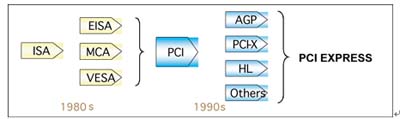 Local Bus)、PCI(Peripheral Component Interconnect)、PCI-X及AGP等傳輸接口,歷經(jīng)十多年的演進(jìn),此刻遭逢傳輸頻寬上的瓶頸。重新審視這一段演進(jìn)史,PCI在1992年推出后,扮演了統(tǒng)一的角色,一直到1997年才出現(xiàn)AGP取代部分PCI的功能,作為高階繪圖工作的接口標(biāo)準(zhǔn)。