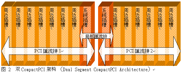 PICMG 2.0 CompactPCI系統(tǒng)是由一組或多組CompactPCI 總線所組成,每個(gè)總線最多可達(dá)8個(gè)CompactPCI板卡插槽,其中包含一個(gè)系統(tǒng)插槽(system slot)與最多達(dá)7個(gè)外圍插槽(peripheral slot)。PCI總線是作為該總線內(nèi)插槽之間的主要通訊途徑,在這個(gè)架構(gòu)下,PCI總線與系統(tǒng)插槽是一個(gè)可能的故障單點(diǎn),故障的周邊插槽會(huì)讓整個(gè)PCI總線停止作用而阻礙了其它任一插槽之間的通訊。這種故障單點(diǎn)成為CompactPCI采用高可靠度應(yīng)用的一個(gè)主要障礙,早期的CompactPCI 高可靠度系統(tǒng)架構(gòu)必須克服PCI總線單點(diǎn)故障的限制,典型的解決方法則是添加第二個(gè)CompactPCI 總線且讓此二個(gè)總線的功能相同。圖2顯示雙CompactPCI 總線架構(gòu)的范例。