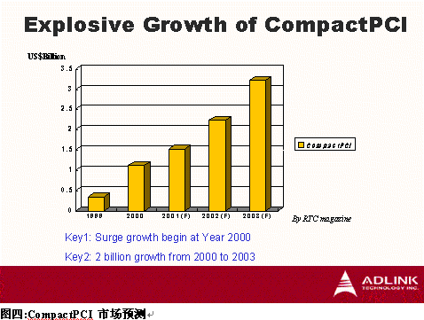 Magazine 估計,CompactPCI市場將由1999年的美金$350 Million成長到2003年的美金$3200 Million,年復(fù)合成長率高達45.6%,其中又以2002年至2003年最大幅成長。CompactPCI為工業(yè)計算機產(chǎn)業(yè)開拓了一個以往傳統(tǒng)工業(yè)計算機無法應(yīng)用的新市場,而CompactPCI需針對電信等級應(yīng)用提供高可靠度及達到嚴苛高品質(zhì)要求,卻又為傳統(tǒng)工業(yè)計算機廠商豎立高進入障礙,因此,目前能提供電信級CompactPCI寬頻通訊平臺幾為國外廠商,如Motorola、Ziatech、Force