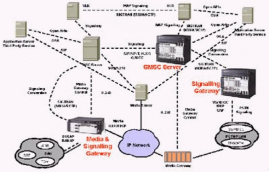 本例中的媒體網(wǎng)關(guān)控制器(MGC)終結(jié)所有的信令,包括直接傳輸?shù)暮屯ㄟ^IP的信令,完成如一個SIP電話向PSTN網(wǎng)絡(luò)發(fā)送信號之類的信令互通,還對打到VoIP網(wǎng)絡(luò)的呼叫進行鑒權(quán)和選擇路由,并提供計費信息。這個MGC還通過SIP/SIP-T,H.323或Q.BICC與其他的MGC通信。