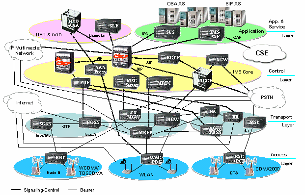 控制層是由以IMS為核心的所有控制部分所組成。IMS獨立于接入技術(shù),是3G"家族"公用的。IMS基于IP技術(shù),支持語音、視頻、文字、數(shù)據(jù)等業(yè)務(wù)以及這些業(yè)務(wù)的組合,支持IPv6和QoS,支持開放的業(yè)務(wù)接口。該層還包括如MSC服務(wù)器,信令網(wǎng)關(guān)等設(shè)備。