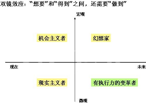 第二種左上角是“機(jī)會(huì)主義者”,既有宏觀的視角,又注重當(dāng)前的機(jī)會(huì),然而遺憾的是往往這樣缺乏足夠的前瞻性,抓住了眼前的機(jī)會(huì),卻錯(cuò)失了未來的藍(lán)圖和方向。