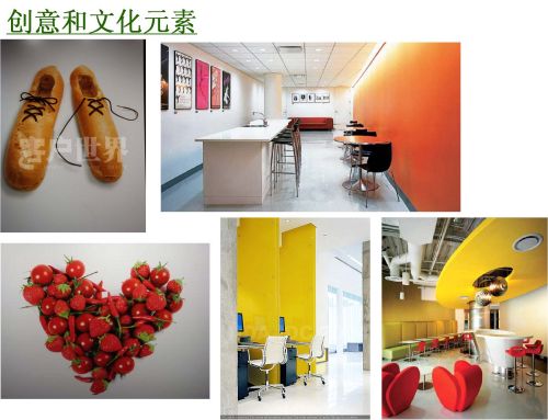 左下邊的這個(gè)圖是我自己非常喜歡的,就是在一個(gè)咖啡館里面,用一些番茄、一些小的辣椒和一些草莓搭成這樣一個(gè)形狀。上面大家看是鞋子,其實(shí)是兩塊面包把中間挖空了,鞋帶是巧克力,用這種方式來調(diào)動(dòng)別人在咖啡館里面的食欲。我們?cè)谠挿坷锩媸且粯拥,要讓客服代表,特別是那個(gè)年齡段20-25歲之間年輕的男孩子和女孩子們喜歡,甚至他們有一種重回學(xué)校的感覺都可以。所以這里面不用花太多的心思可以有很好的創(chuàng)意。在這個(gè)話房的設(shè)計(jì)當(dāng)中,覺得從環(huán)境的角度和自己能夠著手去改變的角度來看,已經(jīng)可以把你得話房做出自己的特色,就像我們?cè)谧约杭依镅b修一樣,可以有不同的色彩,也可以由不同的結(jié)構(gòu),當(dāng)然需要滿足公司給你預(yù)算的要求。