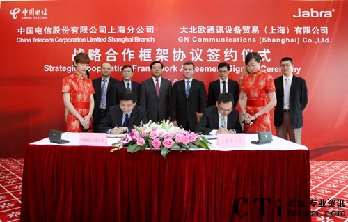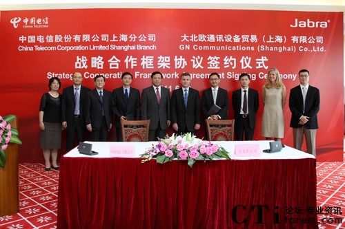 CTI論壇(ctiforum)6月23日消息(記者 楊佳林):上海—全球領(lǐng)先的創(chuàng)新耳麥解決方案提供商大北歐公司(GN Netcom)與中國(guó)電信上海公司(以下簡(jiǎn)稱(chēng)上海電信)今日隆重舉辦了 “戰(zhàn)略合作框架協(xié)議簽約儀式”。上海電信資深經(jīng)理花銳強(qiáng)、大北歐公司亞太區(qū)總裁Mark Leigh,及雙方公司高層領(lǐng)導(dǎo)共同出席了此次慶典。Mark Leigh先生還代表了大北歐公司將Edouard Suenson先生——“將電報(bào)引入中國(guó)的丹麥人”的雕像捐贈(zèng)給上海電信博物館,見(jiàn)證了中國(guó)與丹麥源于19世紀(jì)末在通信方面的成功合作。