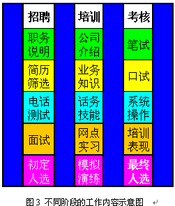 即使經(jīng)過規(guī)范的上崗培訓(xùn)與考核,新員工通常也只達(dá)到老員工70%左右的表現(xiàn)。因此制定明確的實習(xí)期,在實習(xí)期間加強(qiáng)指導(dǎo)和培養(yǎng)是非常重要的。通常經(jīng)過3個月的實習(xí),新員工已經(jīng)可以達(dá)到一個標(biāo)準(zhǔn),這時便可以轉(zhuǎn)正了。圖3和圖4表現(xiàn)了不同階段對CSR的不同預(yù)期,以及不同階段的主要工作。