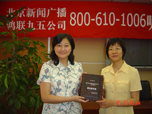 鑒于鴻聯(lián)九五信息處理中信與北京廣播電臺(tái)新聞臺(tái)的合作中所提供的高水平的服務(wù),近期,新聞臺(tái)李臺(tái)長(zhǎng)在聽眾見面會(huì)上親自將最佳合作獎(jiǎng)交到鴻聯(lián)九五總經(jīng)理趙薇的手中,并熱切希望開拓今后合作,努力走出一條呼叫中心和媒體合作的新路。