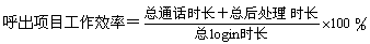 - 定義:呼出項(xiàng)目的工作效率是衡量呼出項(xiàng)目座席工作負(fù)荷率的主要KPI,一般指某段統(tǒng)計(jì)時(shí)間內(nèi),總處理時(shí)長與登錄系統(tǒng)時(shí)長的比率。對于沒有座席操作系統(tǒng)的呼叫中心可以將分母換成計(jì)劃工作時(shí)長。