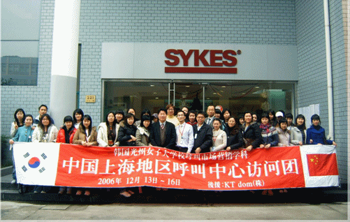 2006年12月14日上午,韓國光州女子大學(xué)呼叫市場營銷系30多名大學(xué)學(xué)生 在鄭成教授等的帶領(lǐng)下,專程來滬參觀訪問賽科斯(Sykes)公司。韓國光州女子大學(xué)是韓國第一個(gè)設(shè)立呼叫市場營銷專業(yè)的大學(xué),該專業(yè)為四年制本科,學(xué)生畢業(yè)后主要從事客戶服務(wù)行業(yè)的基層管理崗位工作。領(lǐng)隊(duì)來訪的韓國光州女子大學(xué)的鄭成教授表示“此次對(duì)賽科斯的訪問非常有意義,希望今后能和賽科斯就呼叫中心各方面的問題有更多的交流與合作機(jī)會(huì)!