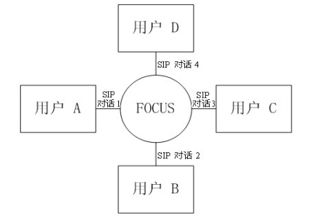緊耦合會(huì)議的邏輯架構(gòu)圖如圖三所示。會(huì)議中的核心是"會(huì)議中心(conference focus)",每一個(gè)會(huì)議都有一個(gè)會(huì)議中心,由一個(gè)URI標(biāo)識,用戶通過聯(lián)系這個(gè)URI參加到一個(gè)會(huì)議中去。會(huì)議中心和用戶之間的拓?fù)浣Y(jié)構(gòu)為星性結(jié)構(gòu)。會(huì)議中心為用戶提供并維持一個(gè)信令連接,并且可以執(zhí)行會(huì)議策略,實(shí)現(xiàn)對會(huì)議的控制和管理。
