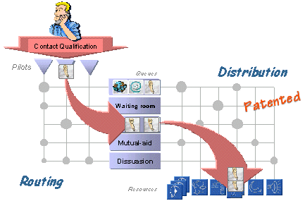 CCD智能呼叫分配器對經(jīng)過呼叫特性鑒別并進入引導(dǎo)系統(tǒng)的呼叫,通過路由選擇矩陣進入不同的等待隊列,并由第二個雙向分配矩陣進行資源選擇或呼叫選擇。CCD先進的雙矩陣分配方式,通過其獨特的技巧和費用最低的路由算法來管理呼叫業(yè)務(wù)和資源,其性能超過當前工業(yè)標準。這種呼叫分配算法的顯著特點之一是恰到好處地分離路由選擇、資源分配以及選擇呼叫三個過程,使其既相對獨立,又靈活選擇。而傳統(tǒng)的“矢量分配”法的主要缺點是僅從呼叫的觀點描述處理,缺乏對正空閑的資源該做些什么加以控制。