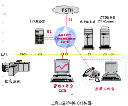 隨著企業(yè)間相互競(jìng)爭(zhēng)的加劇,用戶(hù)對(duì)企業(yè)服務(wù)要求的提高,越來(lái)越多的企業(yè)承諾為用戶(hù)提供一個(gè)24小時(shí)的客戶(hù)服務(wù)環(huán)境,用戶(hù)可以隨時(shí)獲得聲音、文字、文件等服務(wù)。而呼叫中心可為企業(yè)解決這些問(wèn)題。阿爾卡特作為著名的企業(yè)通信產(chǎn)品供應(yīng)商,可以為企業(yè)提供一套完整的多媒體呼叫中心平臺(tái)解決方案。上海白貓有限公司是國(guó)內(nèi)著名的洗滌系列產(chǎn)品供應(yīng)商,提供多種渠道為分銷(xiāo)商和用戶(hù)提供產(chǎn)品和服務(wù)。面對(duì)競(jìng)爭(zhēng)對(duì)手,面對(duì)客戶(hù)的要求,上海白貓決定建設(shè)電子商務(wù)平臺(tái),通過(guò)電話(huà)、傳真、郵件、網(wǎng)站各種接入手段,結(jié)合公司的物流系統(tǒng),倉(cāng)庫(kù)管理,網(wǎng)站系統(tǒng),建立客戶(hù)關(guān)系管理,經(jīng)營(yíng)策略分析。從而鞏固其在同行業(yè)的地位,獲得更大的競(jìng)爭(zhēng)力。阿爾卡特為上海白貓有限公司提供OmniPCX 4400交換機(jī)解決方案。采用CCD排隊(duì)軟件,采用CCS呼叫管理軟件。CTI中間件采用CT-Connect。上海貝爾阿爾卡特公司供稿 CTI論壇編輯